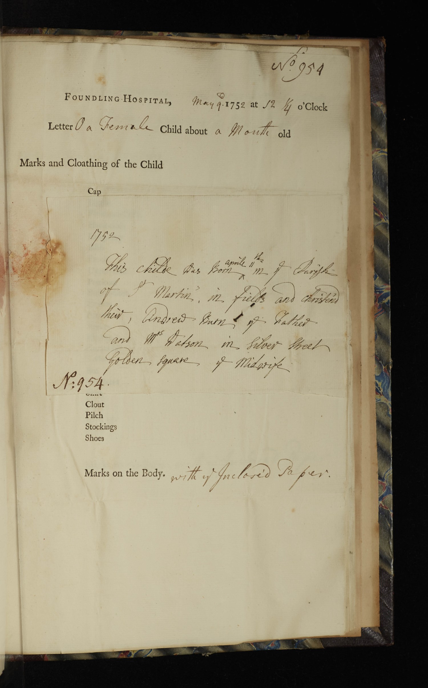 We know that the baby who became Foundling 954 was accepted by the Foundling Hospital on 9 May 1752. A note attached to her billet sheet gives her birth date as 11 April, in the parish of St Martin’s-in-the-Field, London, where she was also baptised. The note states her father’s name as Andrew Burn and that Mrs Watson was the midwife. It contains no information about her mother.