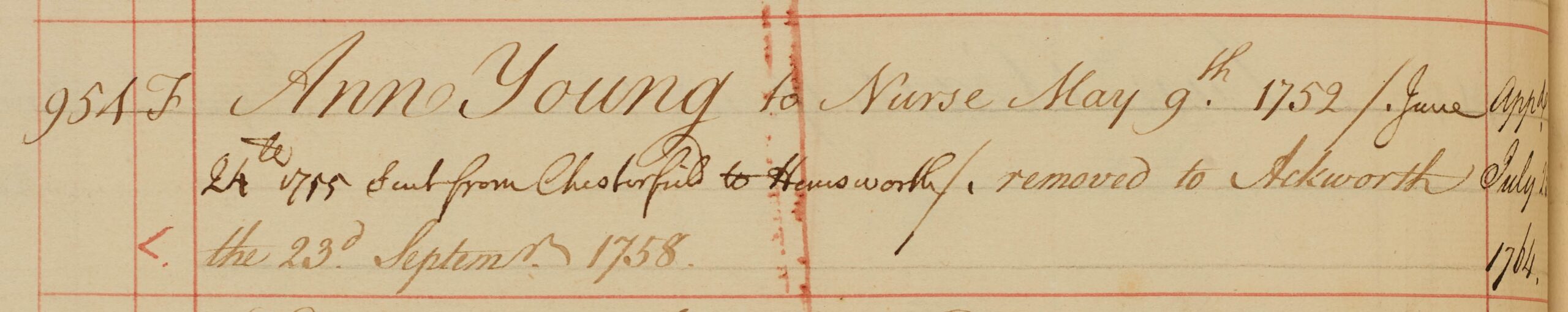 Records in the Foundling Hospital Archive show that Ann Young was given her new name by Miss Cheney and baptised again on 10 May, along with 19 other Foundlings. She was then sent north to a nurse in the Chesterfield area of Derbyshire, where she stayed until June 1755, when she was moved to another nurse in the Hemsworth area of Yorkshire.