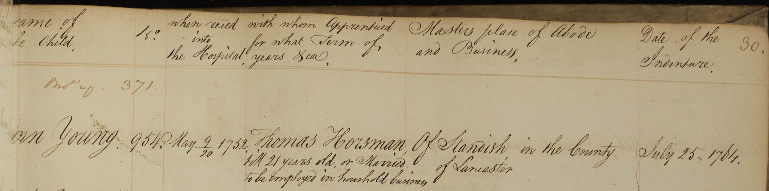 The indenture stated that Ann would remain in Horsman’s employ until her 21st birthday or until she married. The apprenticeship ended early, however, when Thomas died in November 1771, four years after his wife. Ann would have returned to the Ackworth Foundling Hospital. The digitised archive does not record if she was found another position, but this is likely.