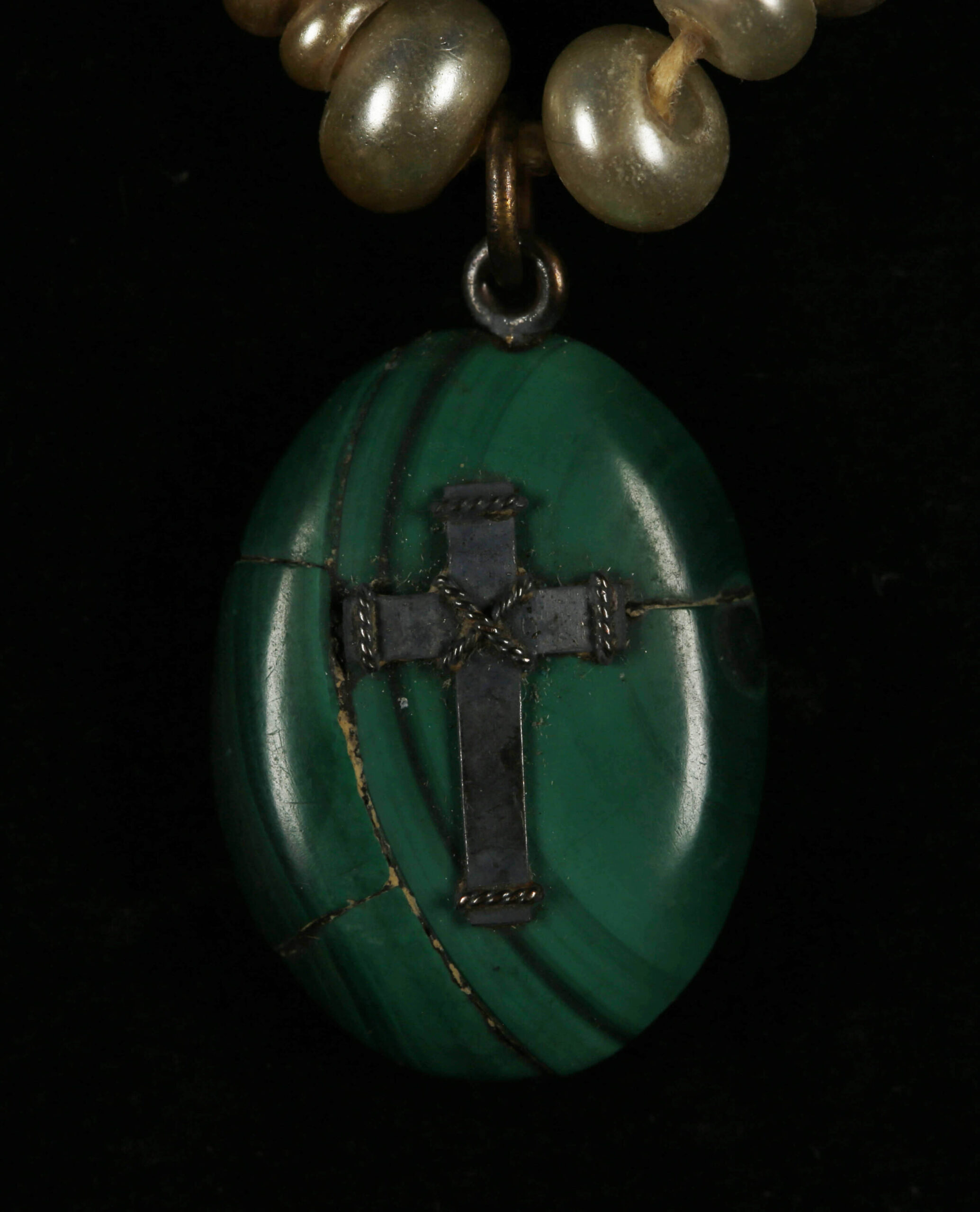 I was going through petition number 22711, labelling it with its new reference number. Initially, I thought this petition included photographs in it due to its thickness, but this wasn’t the case. Instead, I discovered a necklace wrapped in a piece of paper within an envelope. The envelope stated that the necklace was ‘left by Alice Stoffell on January 22nd 1901 for her child’. The necklace has a green stone with a cross attached to it on one side and it appears that there is some textile within a window on the other side. The necklace is stringed with pearls – potentially real but not likely considering Alice’s occupation as a servant – on a ribbon.