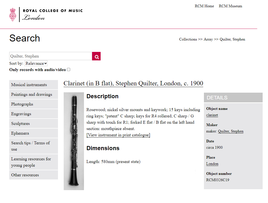 - Royal College of Music Museum: Catalogue record for Stephen Quilter clarinet in B flat, object RCM0326C19. Used with permission.