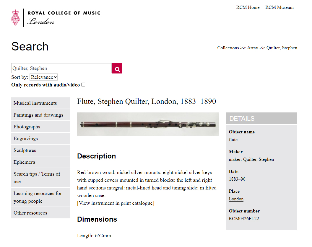 - Royal College of Music Museum: Catalogue record for Stephen Quilter flute, object RCM0326FL22. Used with permission.