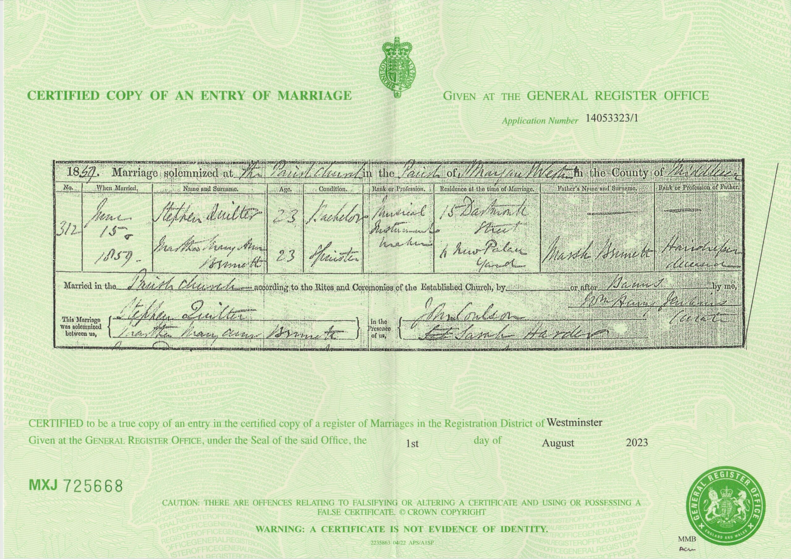 In June 1859 Stephen married Martha Mary Ann Bennett (born in Salisbury, Wiltshire). On their marriage certificate, whilst Martha recorded that her father was a hairdresser from Salisbury, Stephen did not write any details of his heritage.